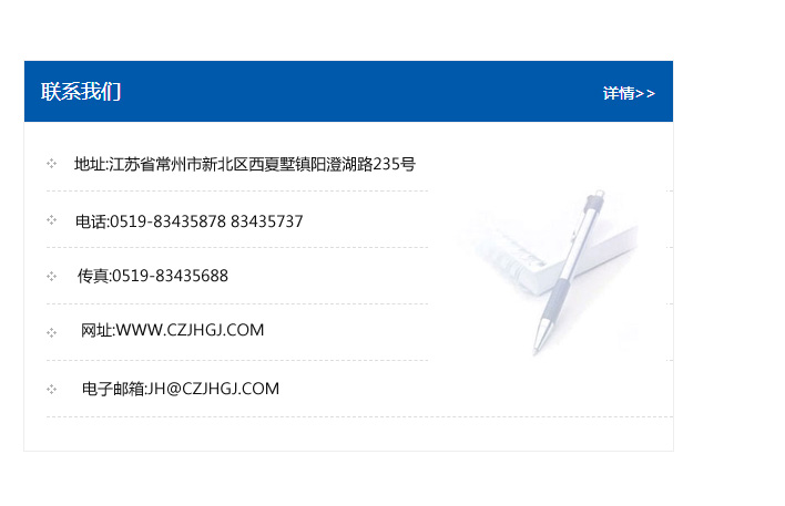 地址:常州市新北區友邦商務大廈1幢16、17層  電話:0519-85101652  傳真:0519-85112595  郵編:213022  網址:www_cz-jiayue_cn.zzbxzg.com  郵箱:xiajifengaa@163.com
